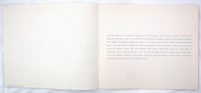 The Imagination (above) series ran from 1963 to 1986 and I think twenty-six issues were published. I‘ve managed to collect them all except for 26 and I think they were the ultimate paper samplers. Each issue chose a subject and explored it with illustrations, graphics and printing techniques on differnt Champion papers. Various well known designers worked on them. From issue twelve James Miho was the Art Director and these samplers became works of art.