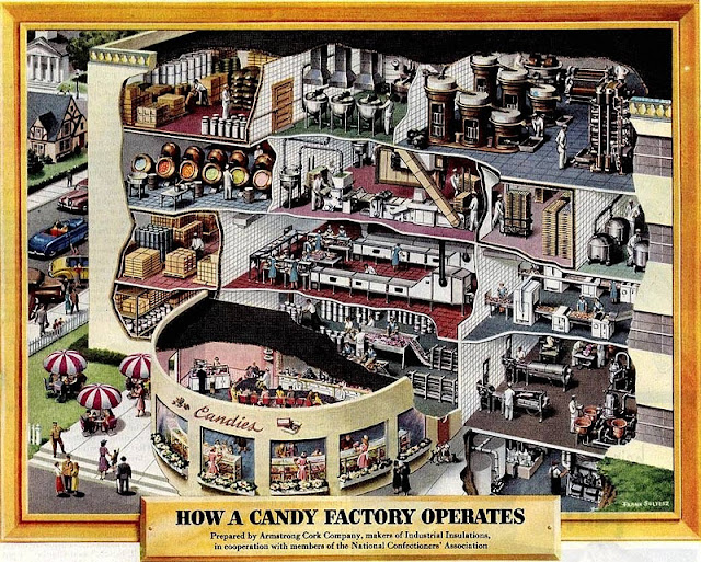 After the war Soltesz went freelance and used an artists agent to generate commissions. One of these was Armstrong Cork who wanted ad illustrations to show how their products were used. I thought it odd that these ads, which ran in the Saturday Evening Post, were for a company that didn’t directly sell anything to the public. To get round this and get the ads looked at complex cutaway illustrations were used and clearly who better than Frank Soltesz to do them. His son says 29 were produced for Armstrong though I’ve only managed to find twenty-five. Cleverly each ad picture was in a frame and titled and readers could send off for a 21 by 22 inch copy, as the ad says ‘suitable for framing’. Later ads in the series offered a free booklet with thirteen of the cutaways.