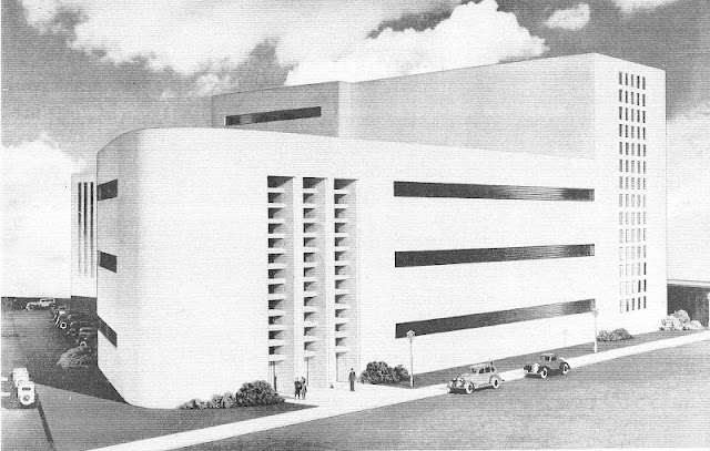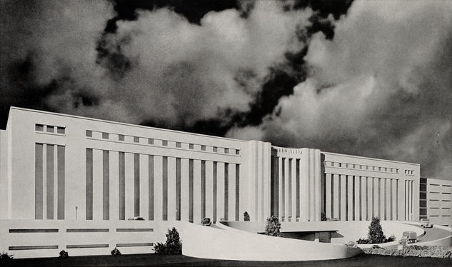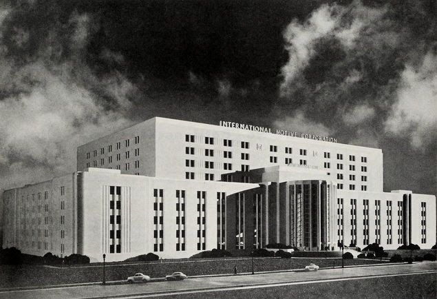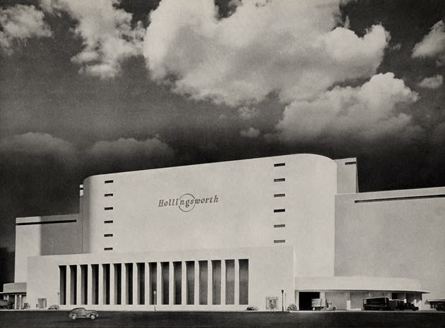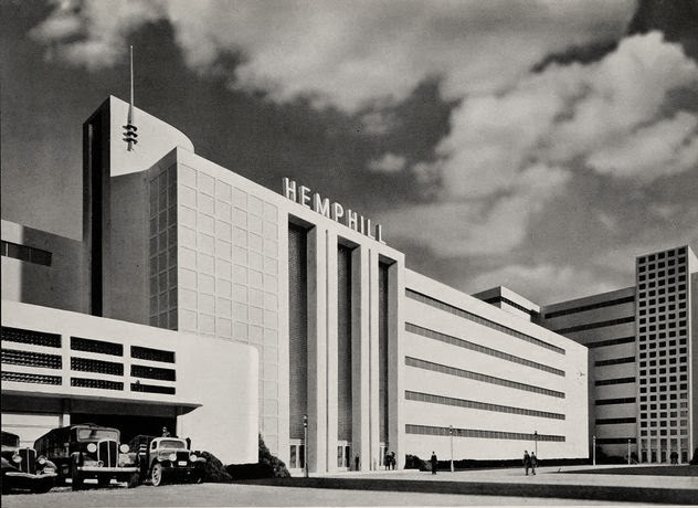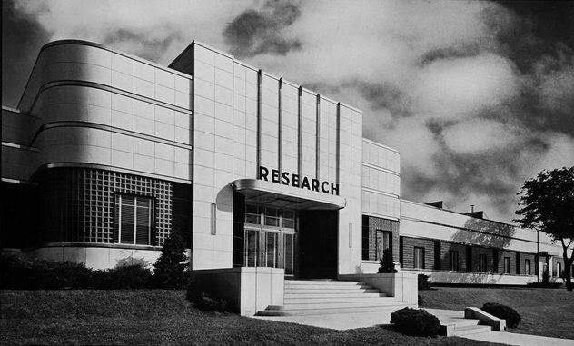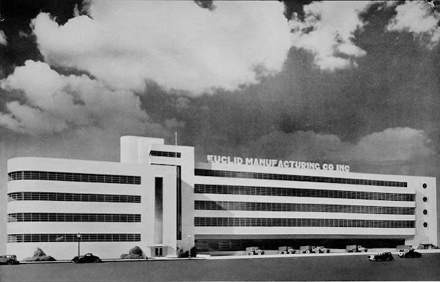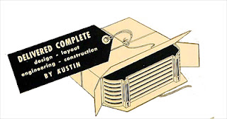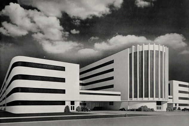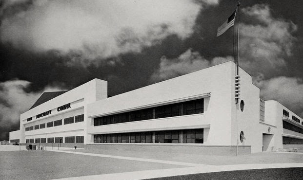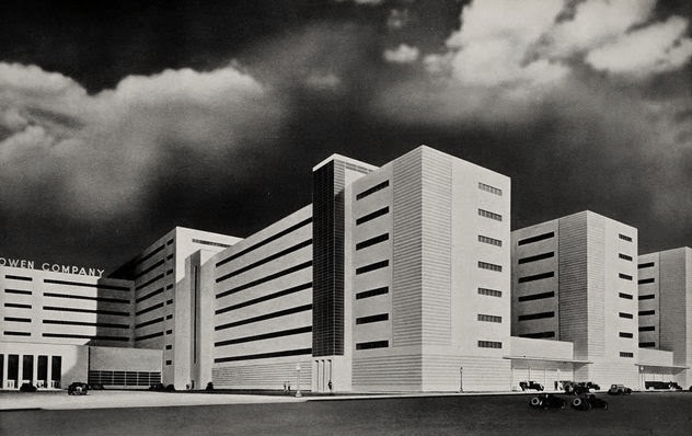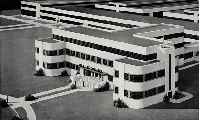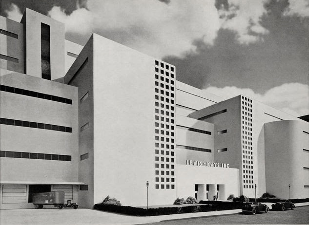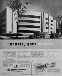 The ads, created by the Cleveland agency Fuller, Smith & Russ, followed a rather traditional design but really stood out because of the brilliant images of streamline buildings, usually filling half the ad. Robert Smith Jr was the Austin Company leading architect and he was encouraged to produce models of buildings to use in the ads. Smith designed the NBC headquarters in Los Angeles, scroll down to see the ad image and below it the real building.