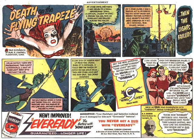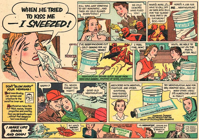 Copywriters pushed their skills in a race to the bottom with some of these situations (look at the third ad down) which had to work in a few frames and usually ending with an angled pack shot in the last panel. Because comic ads looked so like the real thing many of them had to have the word ADVERTISMENT above the ad.