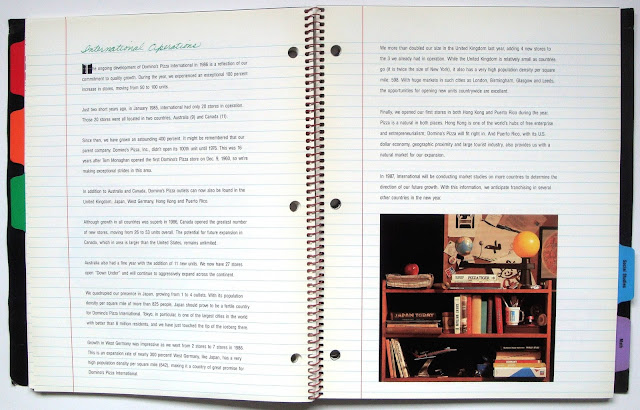 Another winning Domino's Pizza Annual Report from Group 243. A schoolbook with 120, unnumbered, pages printed on a silky semi-matt art paper, the five tab pages are on a thicker paper. Not every page was used, twenty-one are blank and one spread in the Social Sciences section was full of nought's and crosses. The Financials had a three page pull-out for 1982-1986 Highlights. I've only included three spreads from the twenty-one pages in the Financials section.