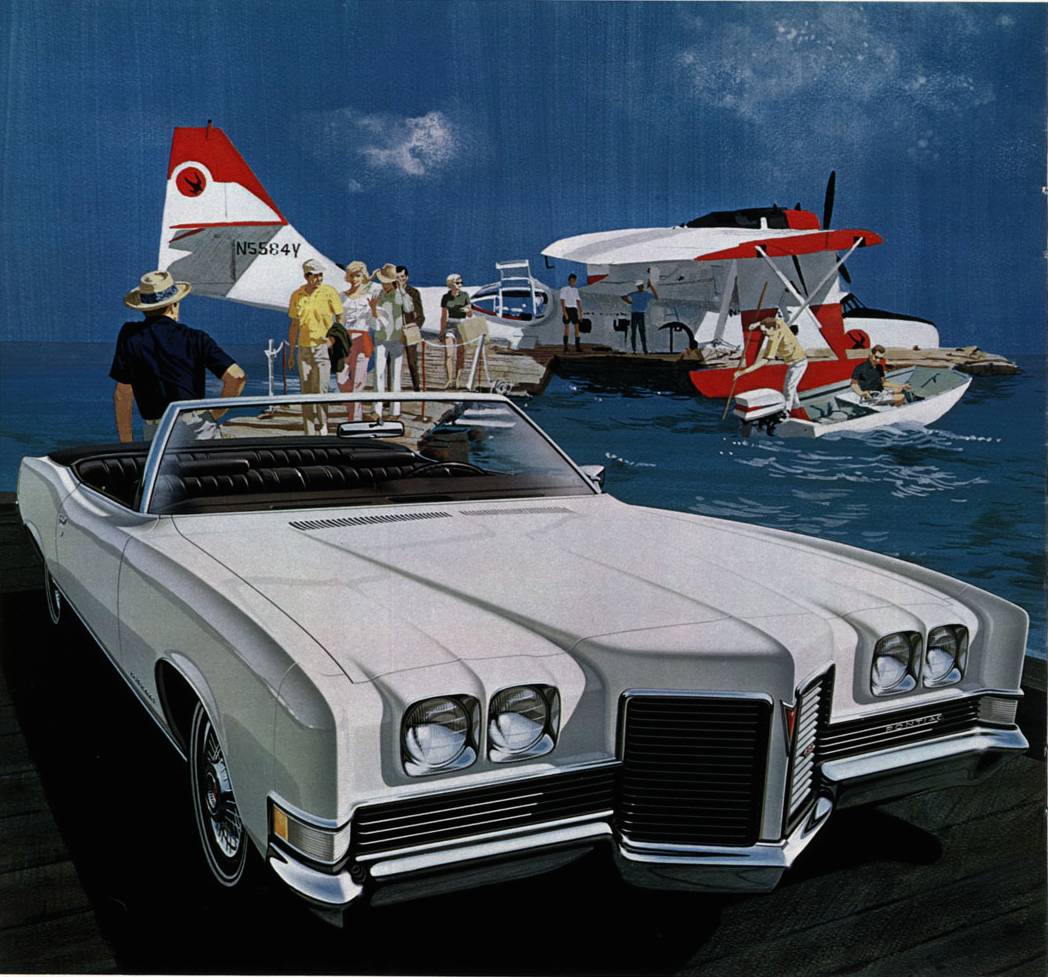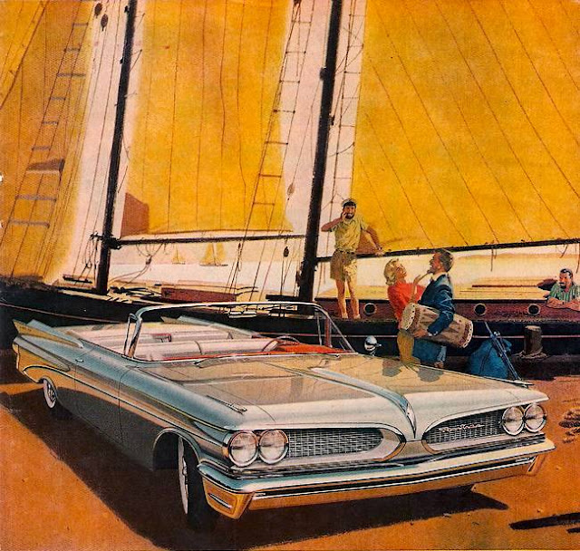 Another helping of those wonderful Pontiac ad paintings by Van Kaufman and Art Fitzpatrick. The first selection (June 2016) looked at the cars at night, this selection shows the cars in a nautical or water setting. Pontiac pitched the copy and illustrations at affluent folk who owned or aspired to own a yacht or maybe something bigger. While the boat is in dock what better car to drive and park by the beach or lakeside.