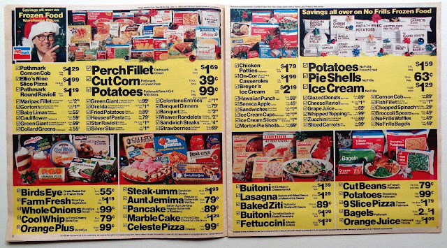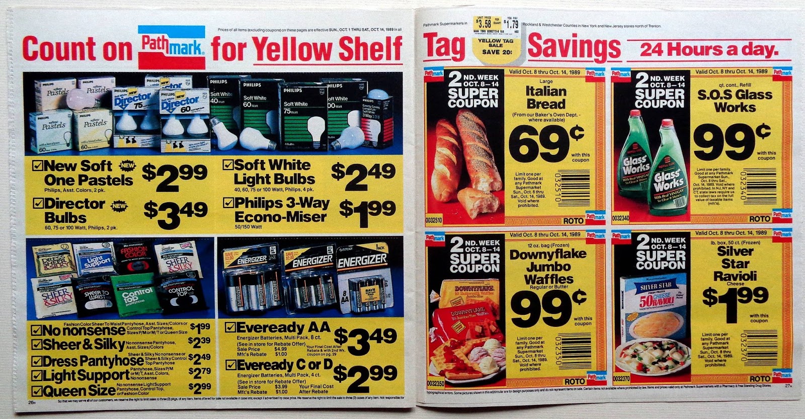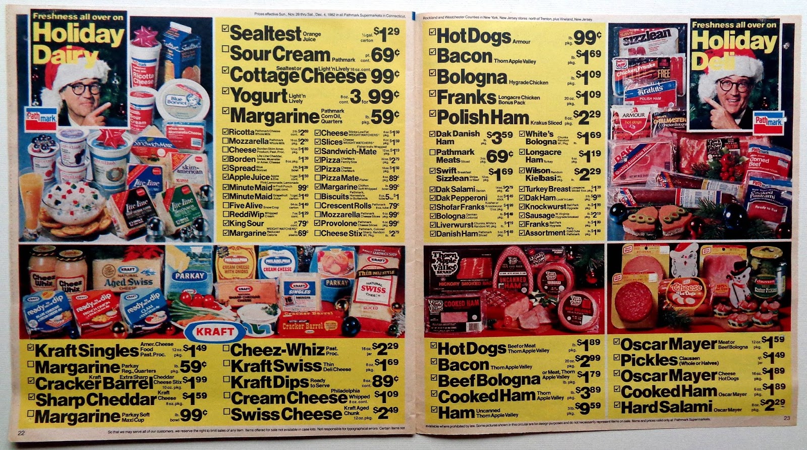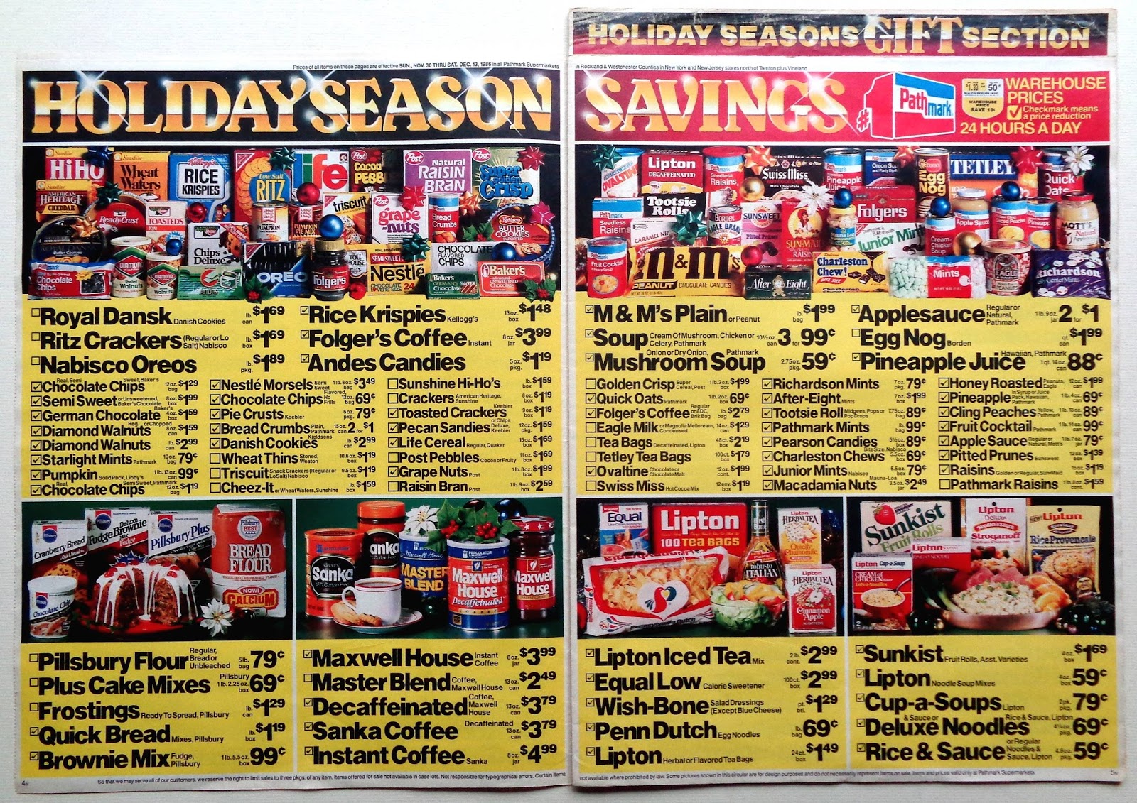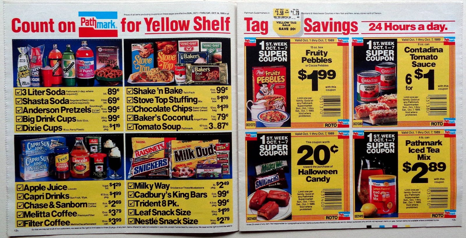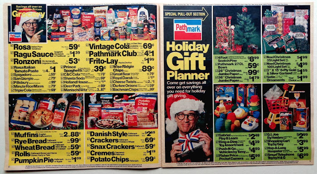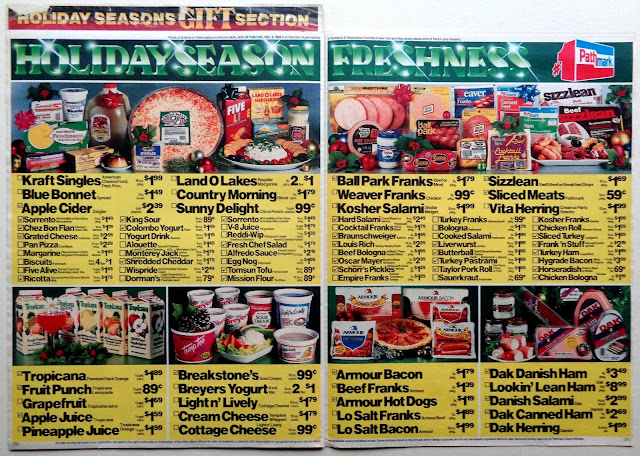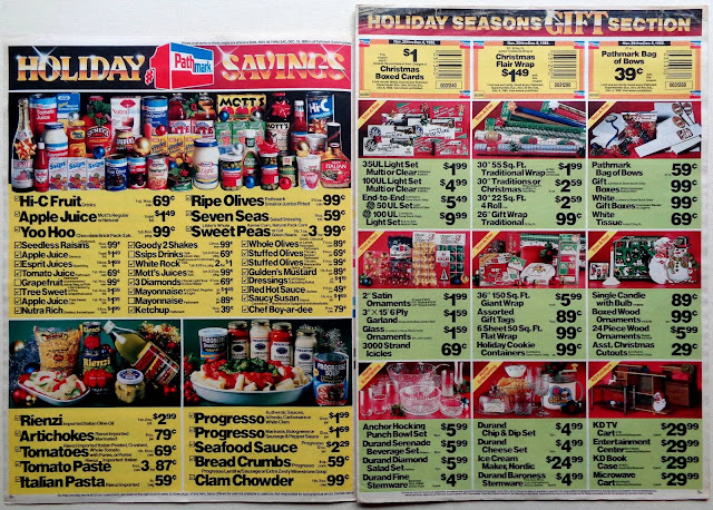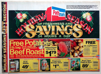 What caught my attention when I saw one in 1982 was the use of Helvetica in various weights and sizes, not a face that would normally be associated with this type of design but what really separates these flyers from others is the use of photos. Usually they have lots of cutout color product shots angled on the page and that makes them look very messy. Pathmark solved that problem by photographing the relevant packs in a still life shot with the copy below the image.