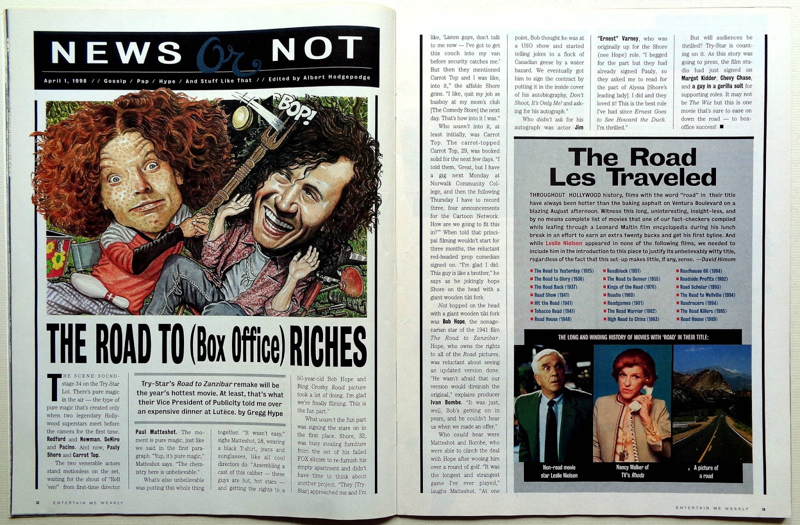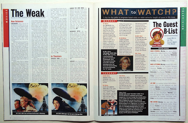 These few pages are from Mad April, 1998 edition where they did a very credible satire on Entertainment Weekly. I thought it was quite successful because it's printed on the same semi-gloss paper as the weekly which meant that color could be used rather that the usual Mad black and white editorial style printed on comic book paper. It's well up to National Lampoon standards in my opinion.nal Lampoon standards in my opinion.