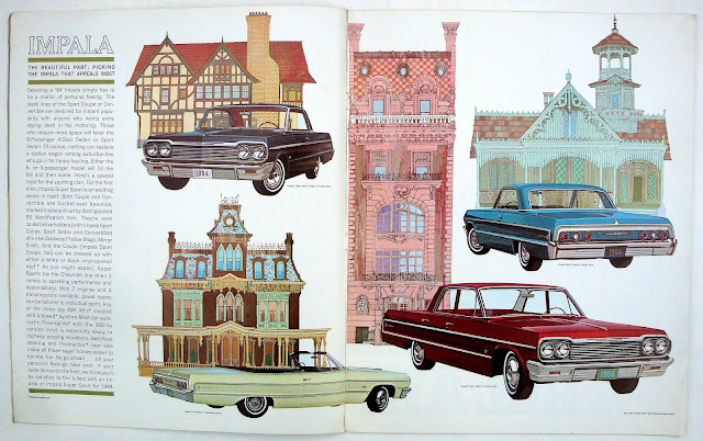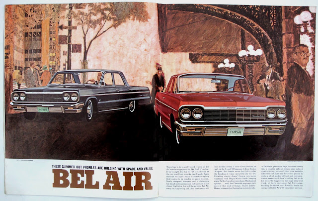 Typical car brochure from Chevrolet in the sixties and to try something slightly different the pages were presented in a magazine format. The Belair spread could have been a fiction feature from the Saturday Evening Post, McCall’s or Redbook. Of course it wasn’t designed by any publication designer because all the text is shown as one paragraph. The last spread with the tech details is a fun read though.There is a GM for '57 brochure in the November 2012 archive
