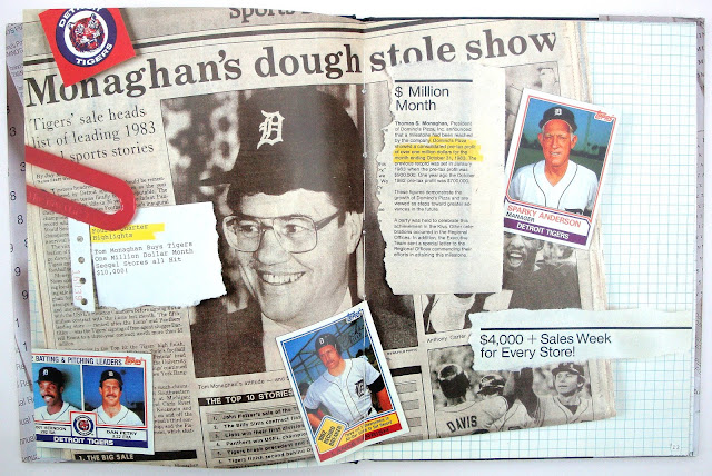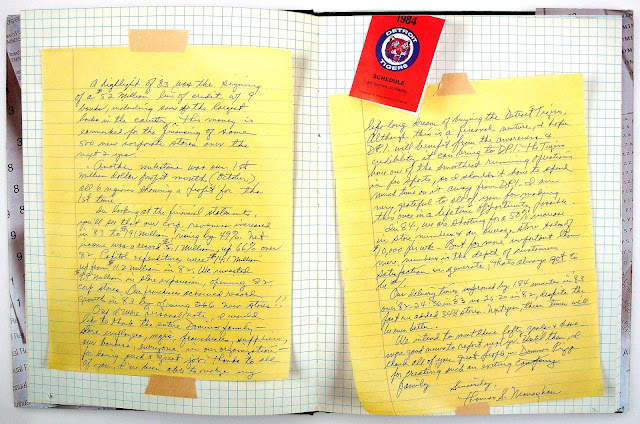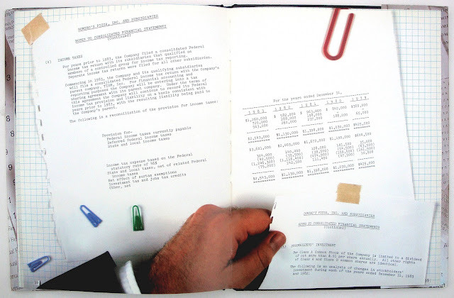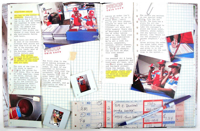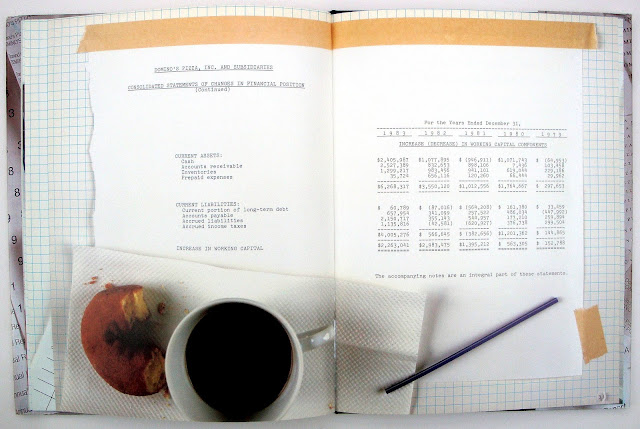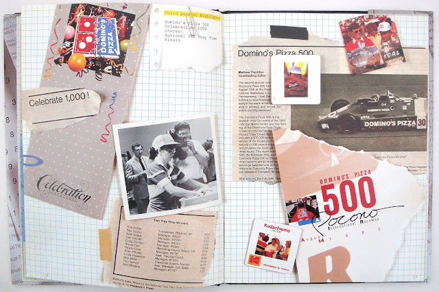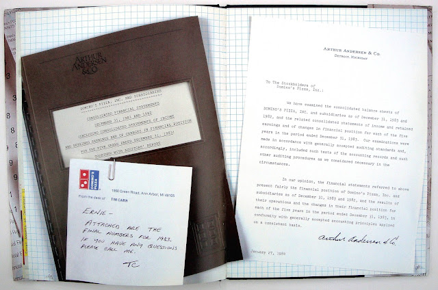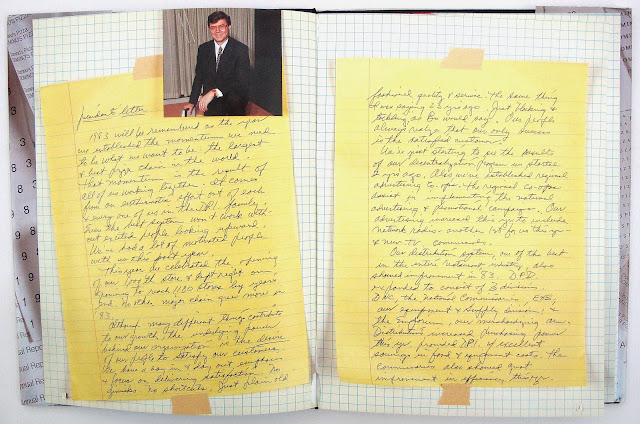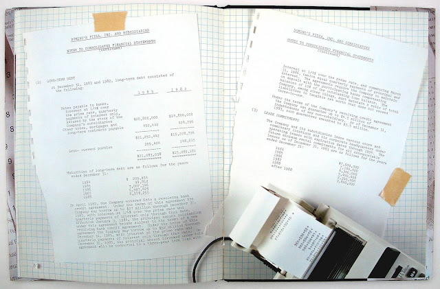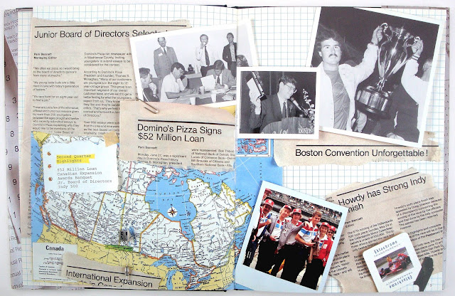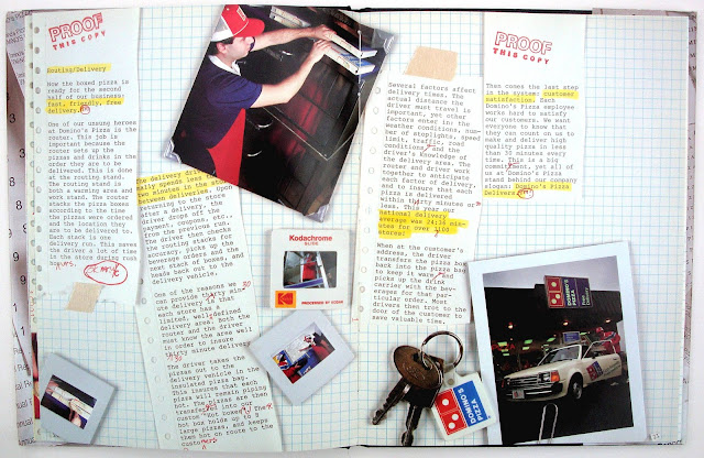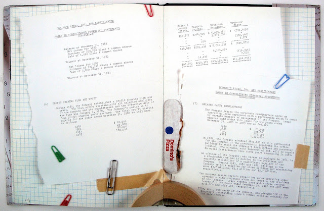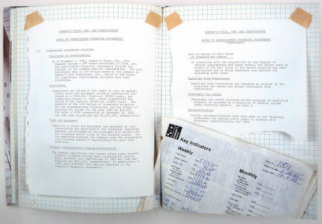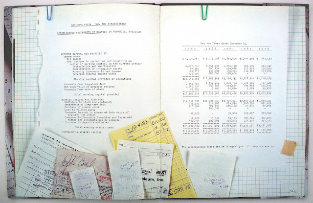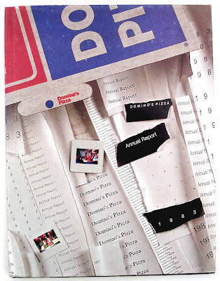 I’ve five of their Reports from the eighties and they look stunning. Designed by Group 243 in Ann Arbor where Ernie Perich was the Creative Director. The one below, for 1983, used a design collage with all sorts of clever visual ideas: a handwritten President’s letter; typewritten copy with spelling mistakes and proofreader’s marks for the corrections; using Domino’s pencils for a bar chart; even though financials are sacred these pages are given a lift by combining them with still life items; using business cards for company officers.