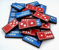 I thought the ’83 Report was creatively brilliant and hard to top but that was until I saw the one for ’84 (see the July Archive) a beautifully made dark wood box with a set of dominoes under the slim spiral bound Report. Annual Reporter broadsheet newspaper, in six sections and in a delivery boy’s bag (unfortunately I never got the bag) told the good news for 1985. ’86 produced a school textbook on glossy paper with sectional plastic tabs. Perich+Partners produced the ’87 version, perhaps a little less exuberant than the others: a twelve inch square box with a ten inch, forty-eight page Report and under that a jigsaw puzzle of Domino’s logo made out of cardboard.