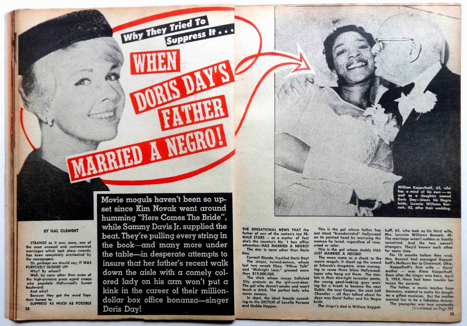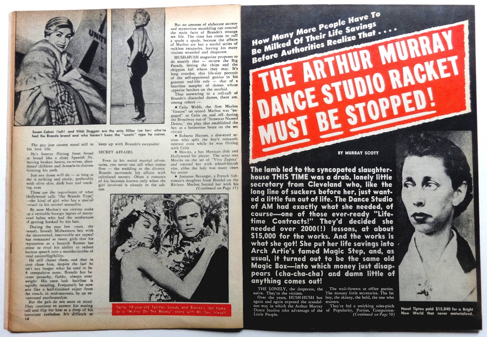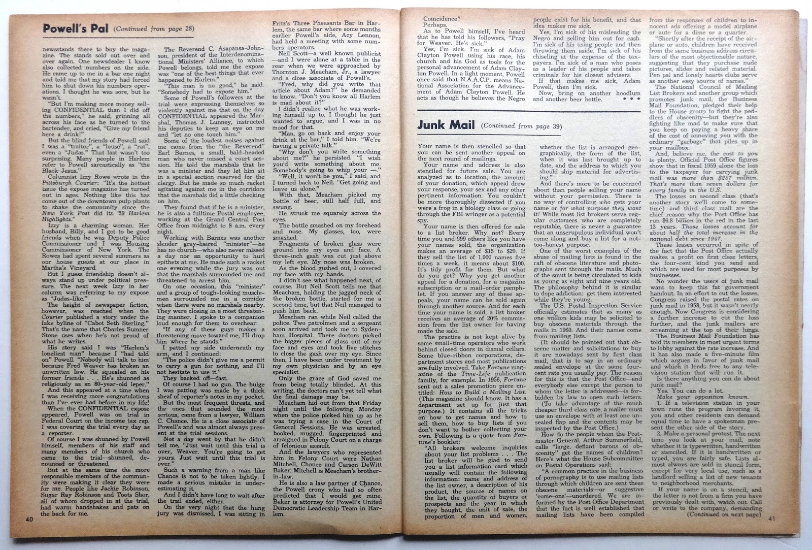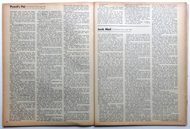 As you can see these magazines were heavy users of hundred magenta plus hundred yellow on their covers. Stock red and grab-you headlines helped to sell millions of copies in the fifties and sixties. Confidential was the leader of the pack with monthly sales in the mid-fifties of five million. All of the titles were printed on pulp paper and despite huge sales national advertisers were obviously reluctant to be seen in these pages, with hardly any ads, except for a few selling down market products, articles were always continued in the back pages of each issue (I've left out a few of these text only pages in the two titles below).